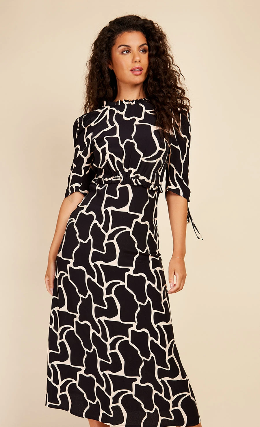The animal print you never knew you needed, but are about to be obsessed with. Splashed with a striking monochrome giraffe print, this effortless midi features a timeless empire cut, tie detail puff sleeves and a flippy hem. Perfect for work and play. Print placement may vary.