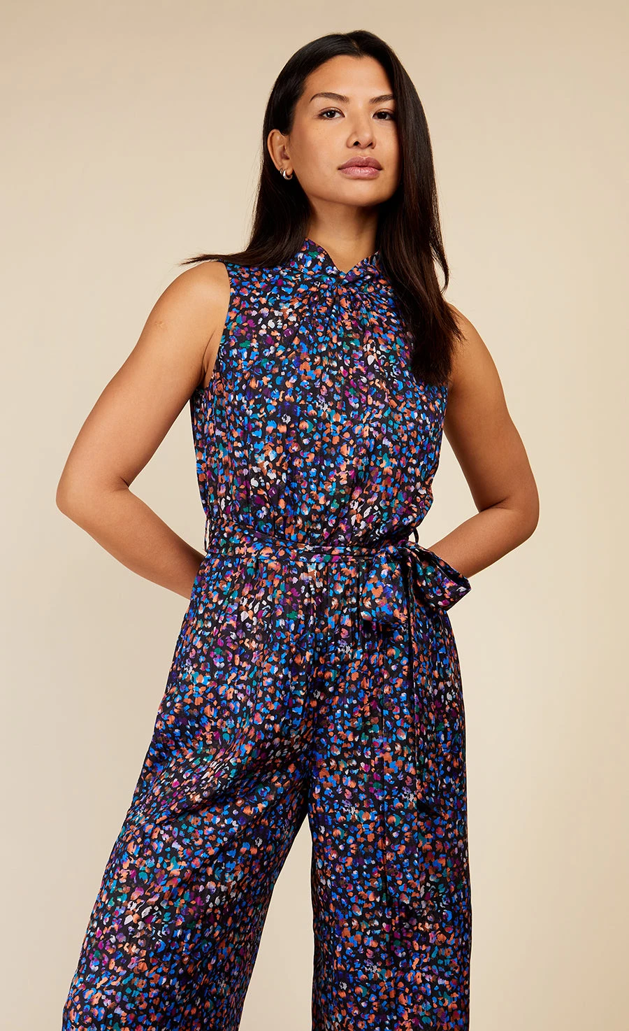 The one-piece wonder, our printed satin jumpsuit cinches in your waist with tie-belt detail, before flowing out into elongated wide-leg trousers. Style with biker boots by day or heels and a clutch by night. Print placement may vary.