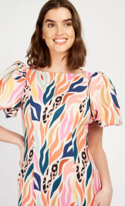 The only thing more uplifting than a bold print? A bold print splashed on a figure-flattering, feel-good dress. Cut to cling to your curves, on-trend puff sleeves are the cherry on top of this standout midi. Print placement may vary.