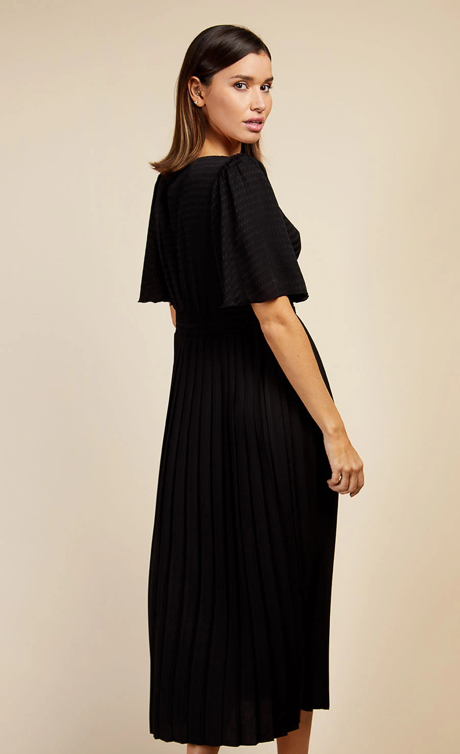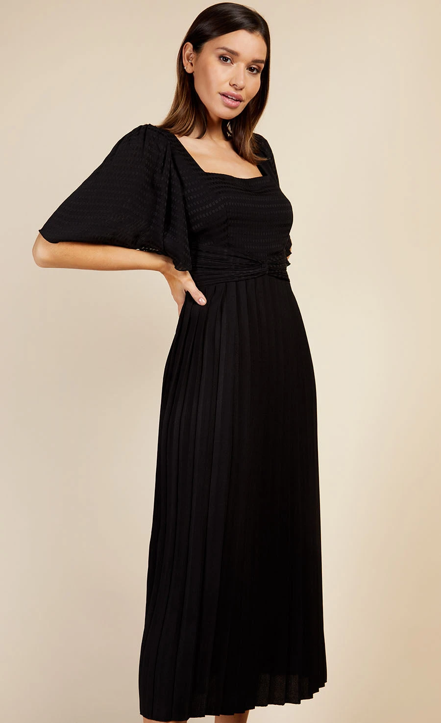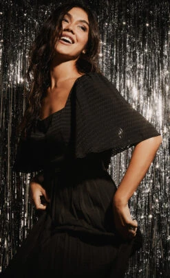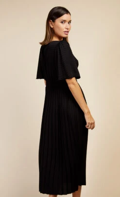 An ultra-sophisticated take on the LBD. Featuring a square neckline, pleated skirt and on-trend angel sleeve design, this dress will take from desk to date with ease, just add a statement earring and heels.