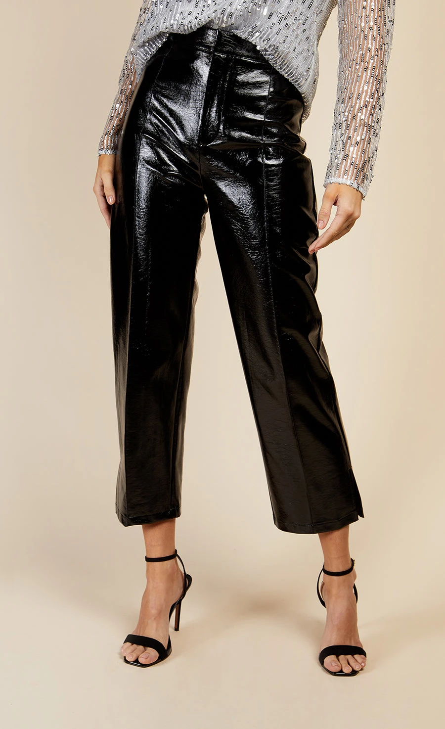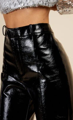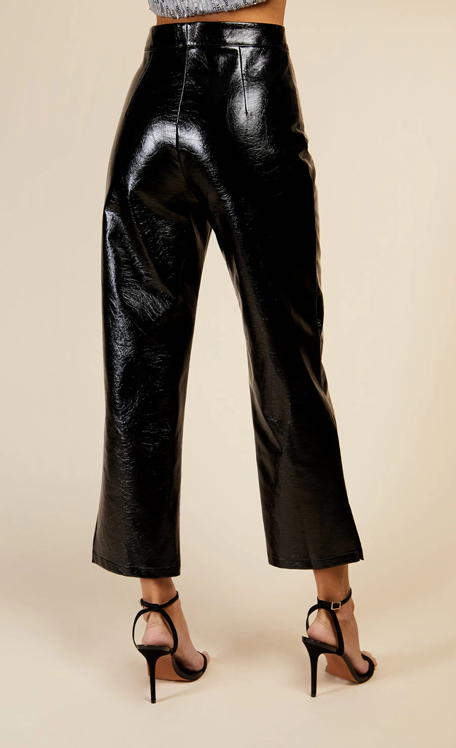 Cracked vinyl PU trousers, fitted waist and straight leg style with a slight kickflare and centre creases. Concealed hook and eye fastener and zip fly closure.