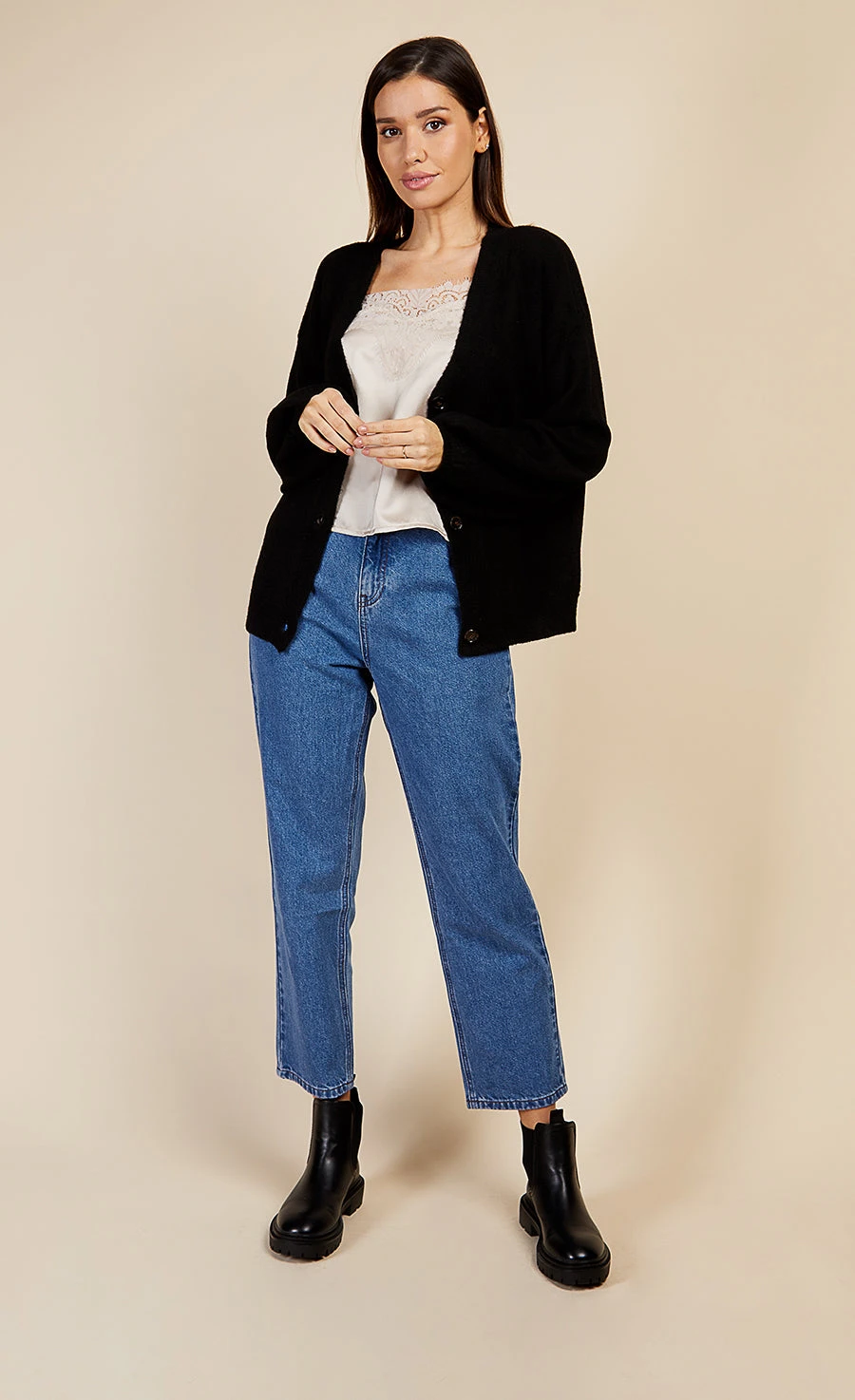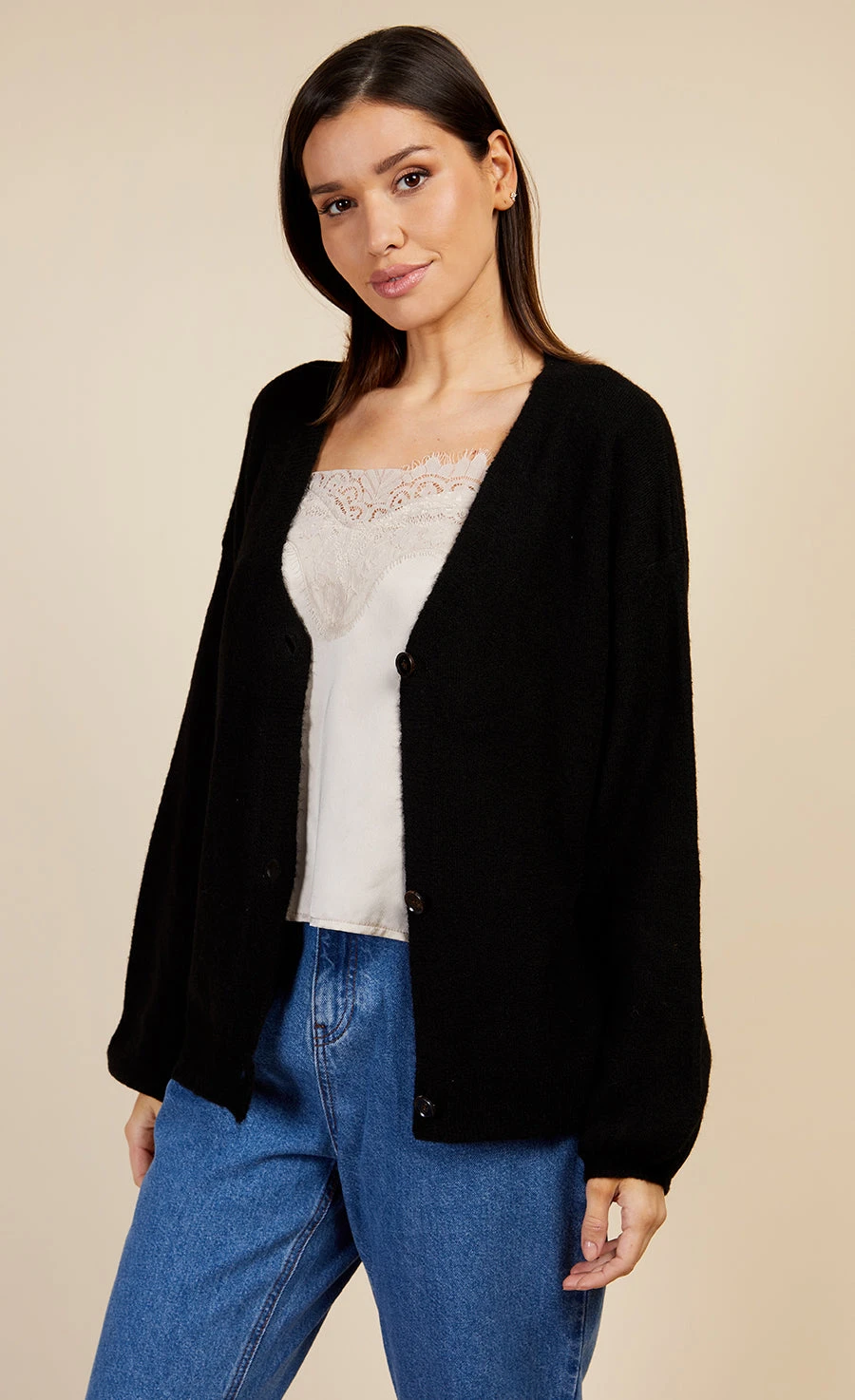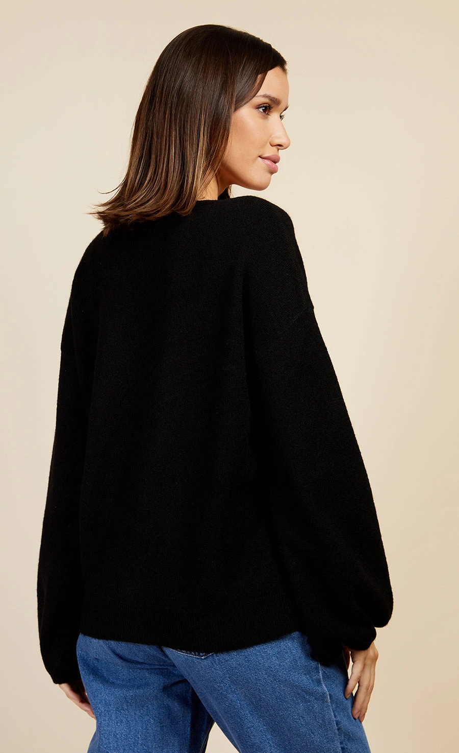 Slouchy fit, light knit cardigan in black with relaxed balloon sleeves and ribbed cuffs and hem. Button up closure at front.