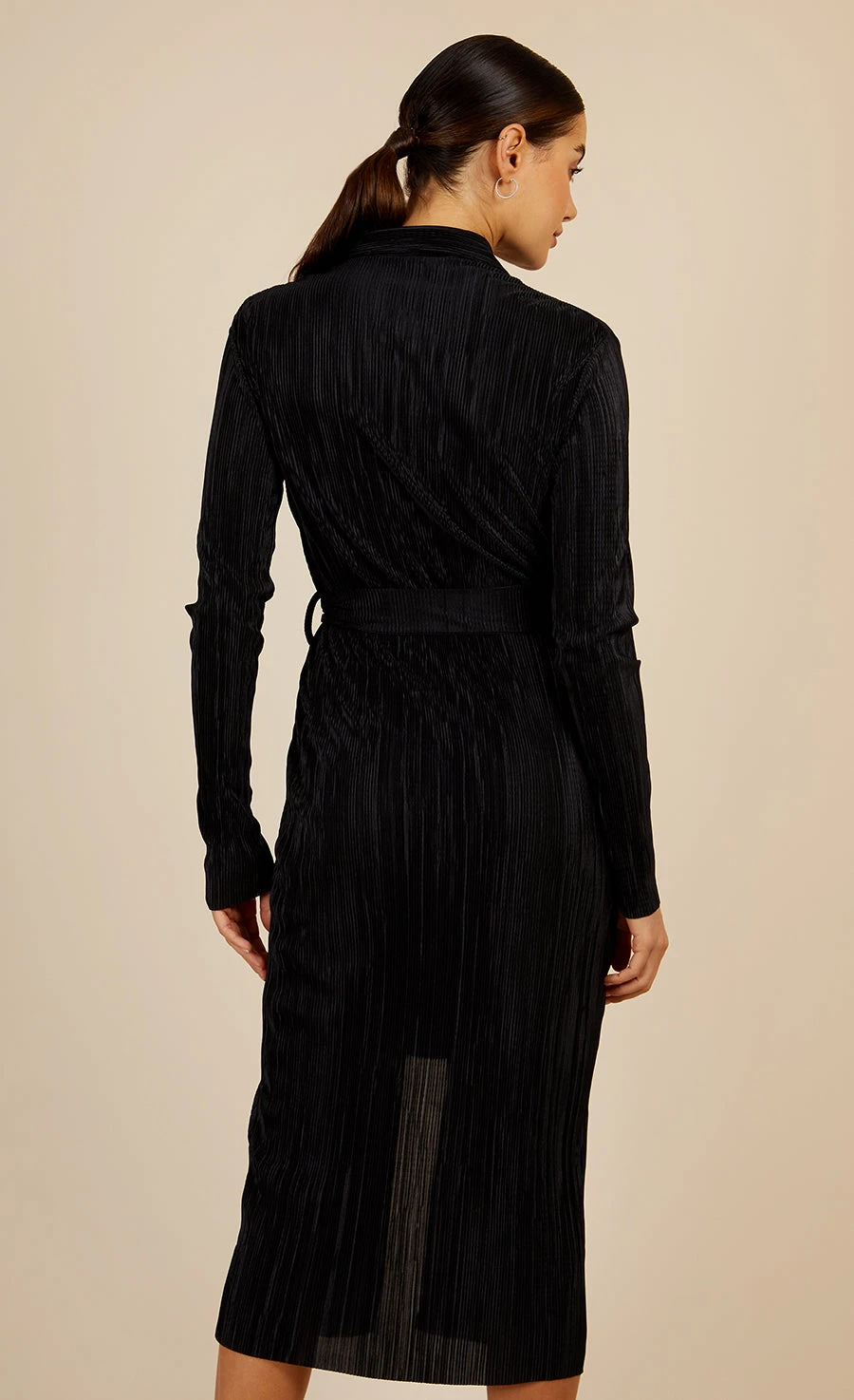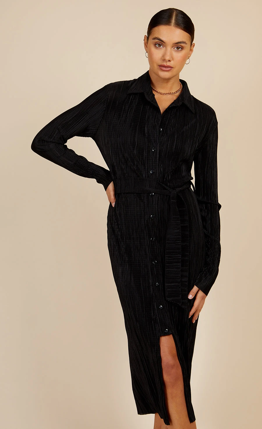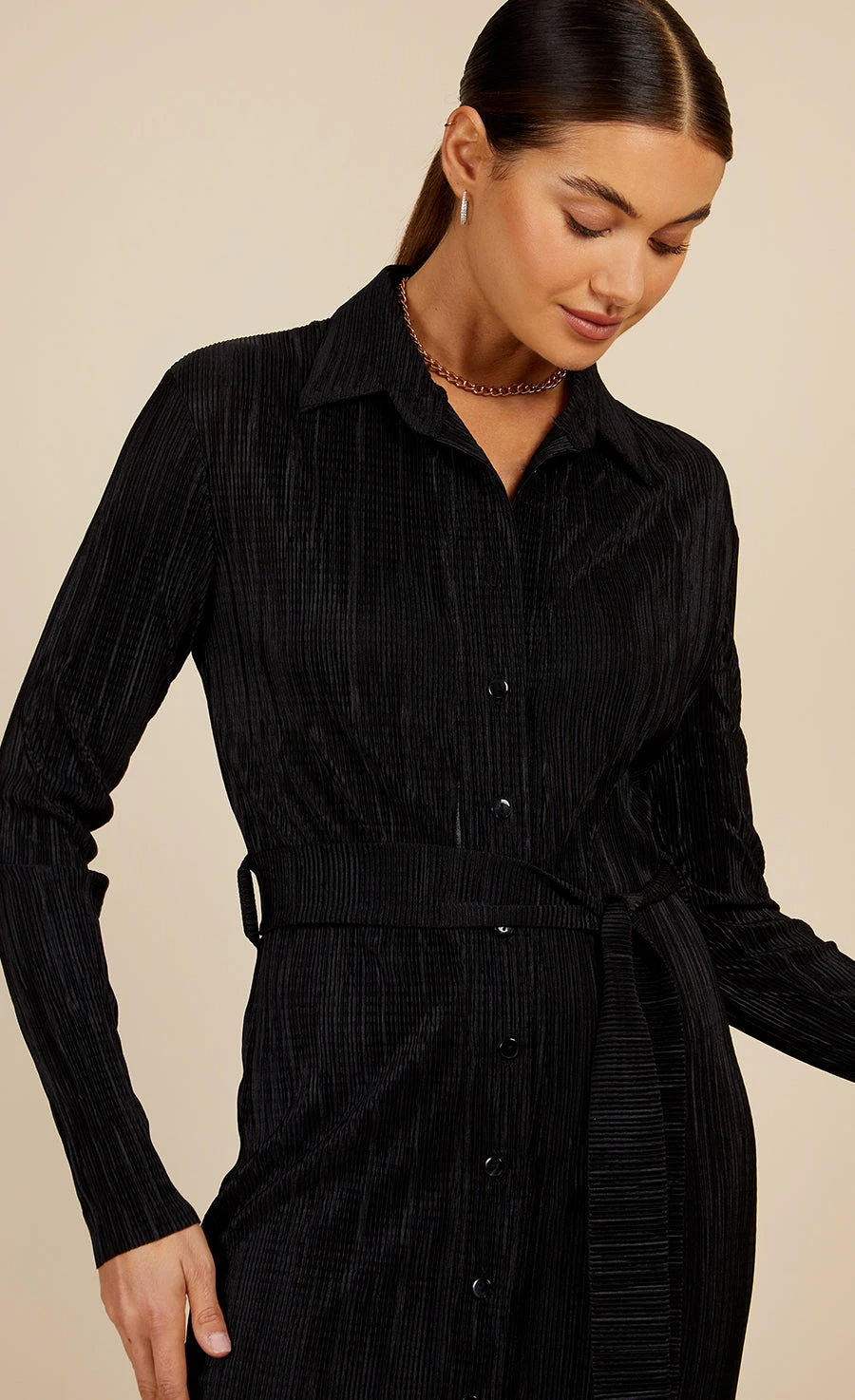Form-fitting black plisse, long sleeved shirt dress, midi length with centre slit and self-tie belt at waist. Â
