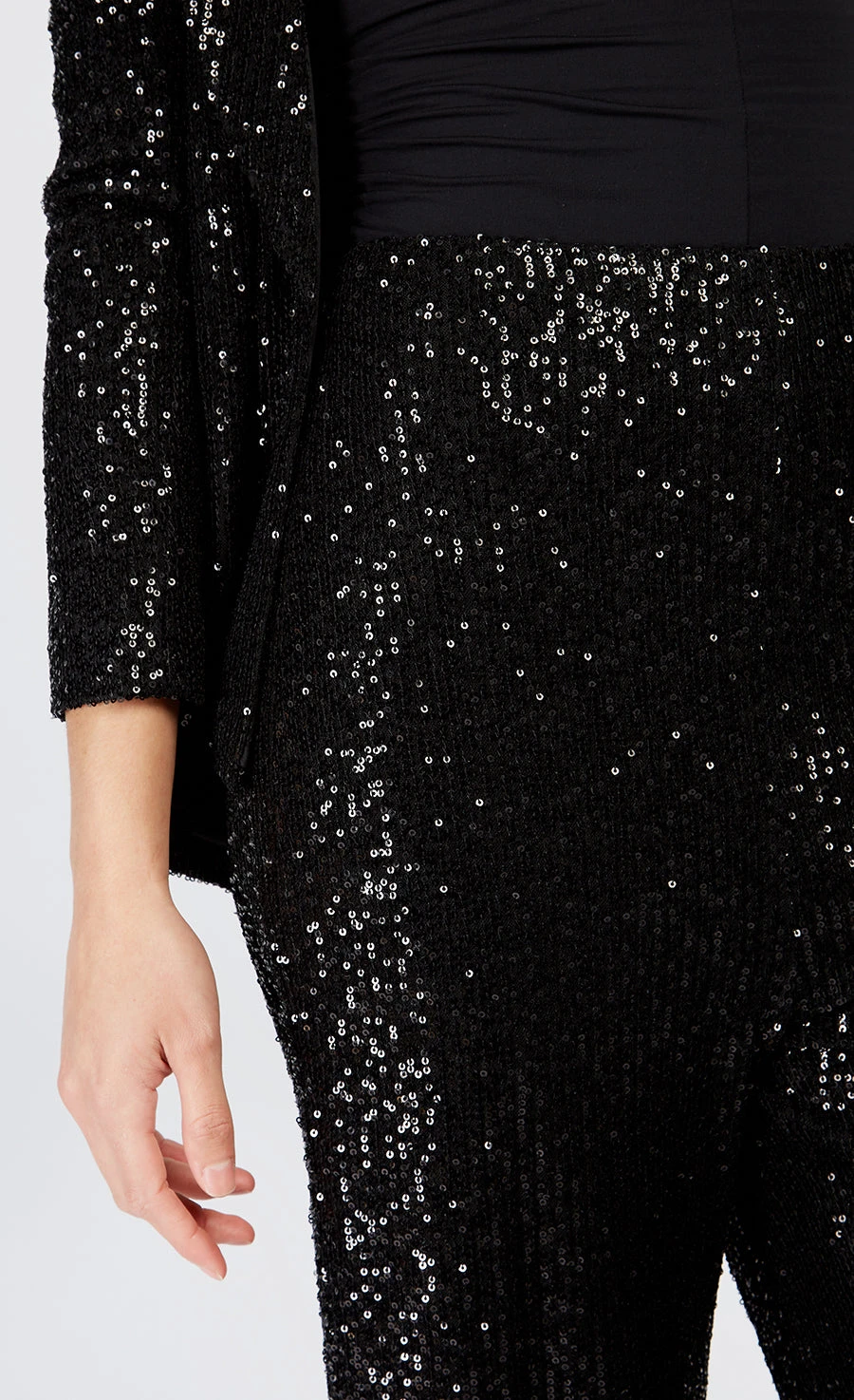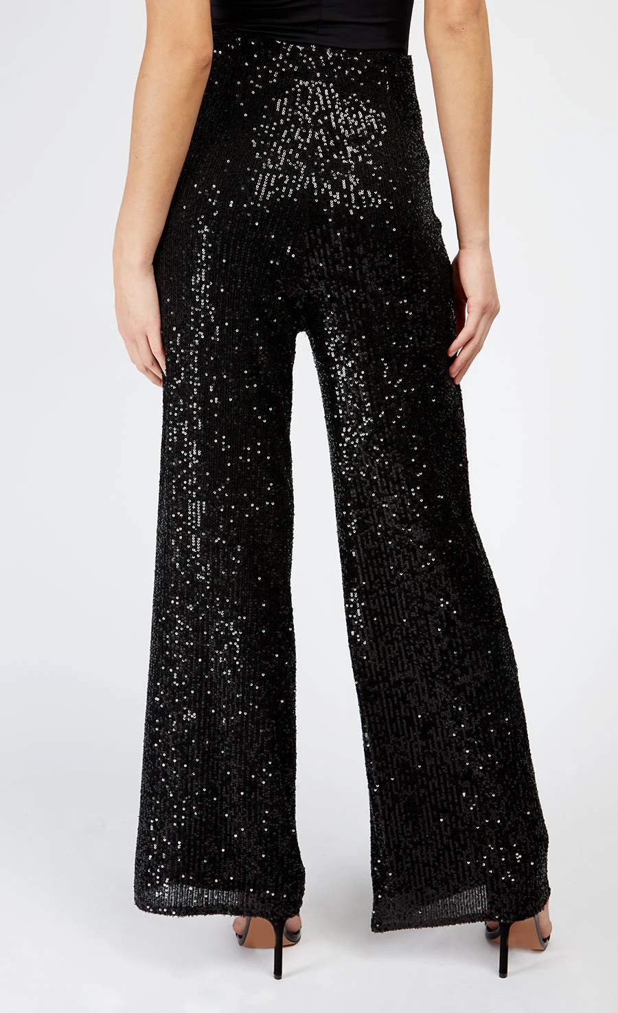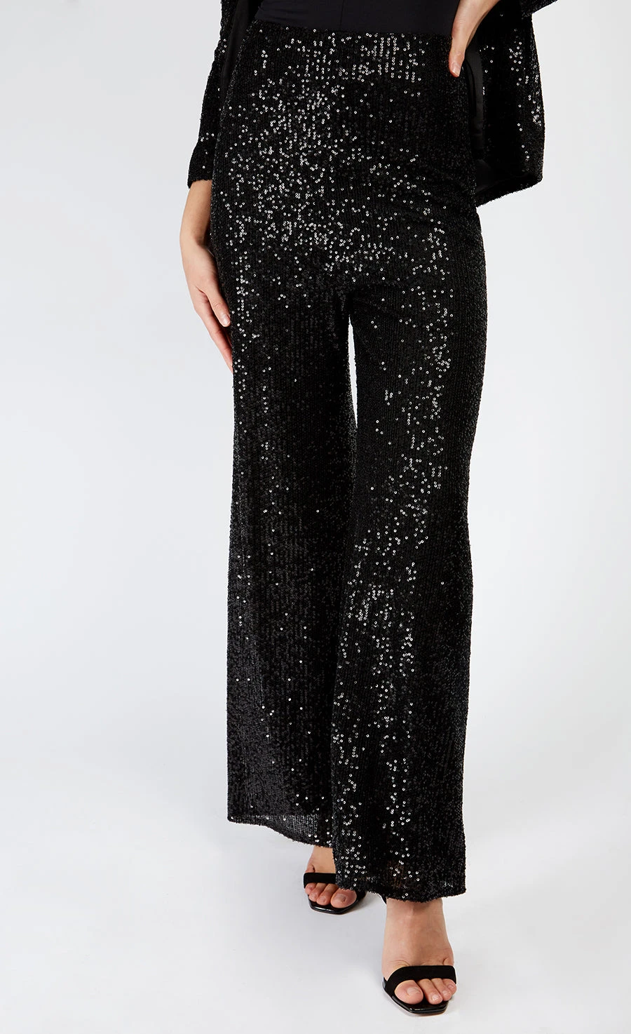 Look super sharp this season in these stunning all over sequin, high-waisted trousers. Crafted from all over sequin fabric, these flattering wide legged trousers are perfect for parties. Match with our black sequin blazer and block heels for a killer look.