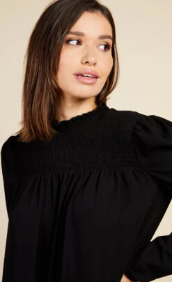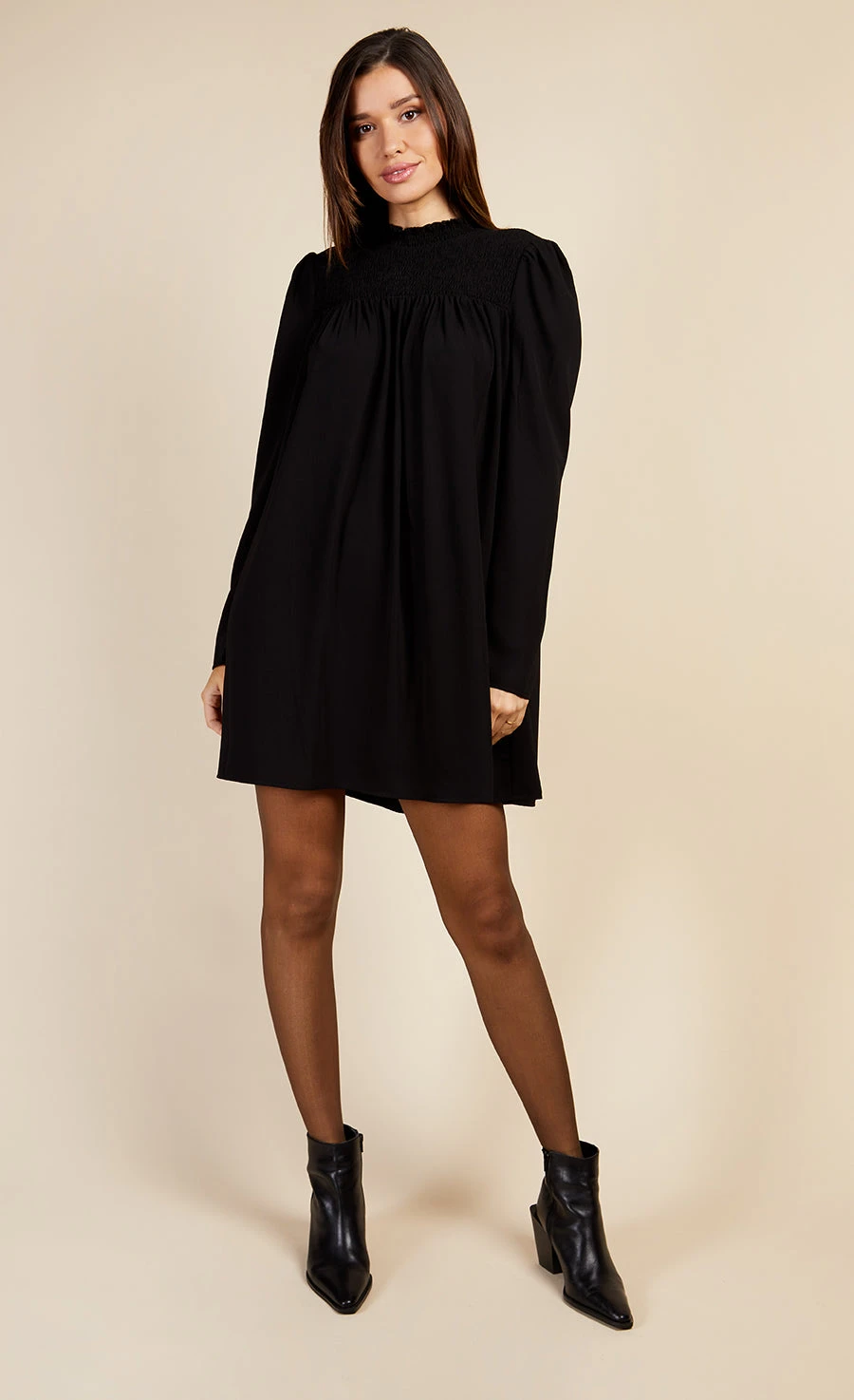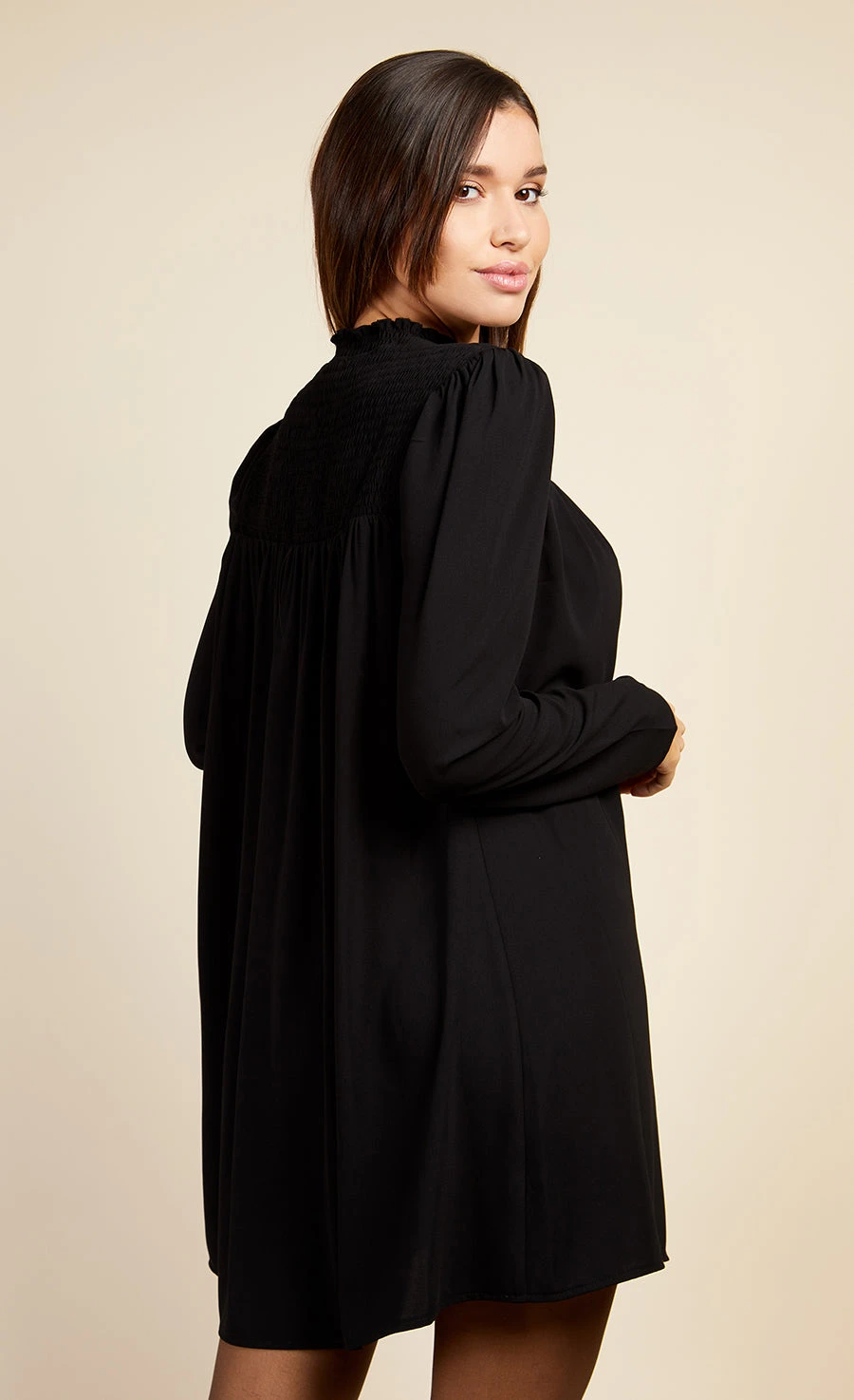 Relaxed fit swing mini dress, featuring ruched top detailing and high collar neckline, with long sleeves.
