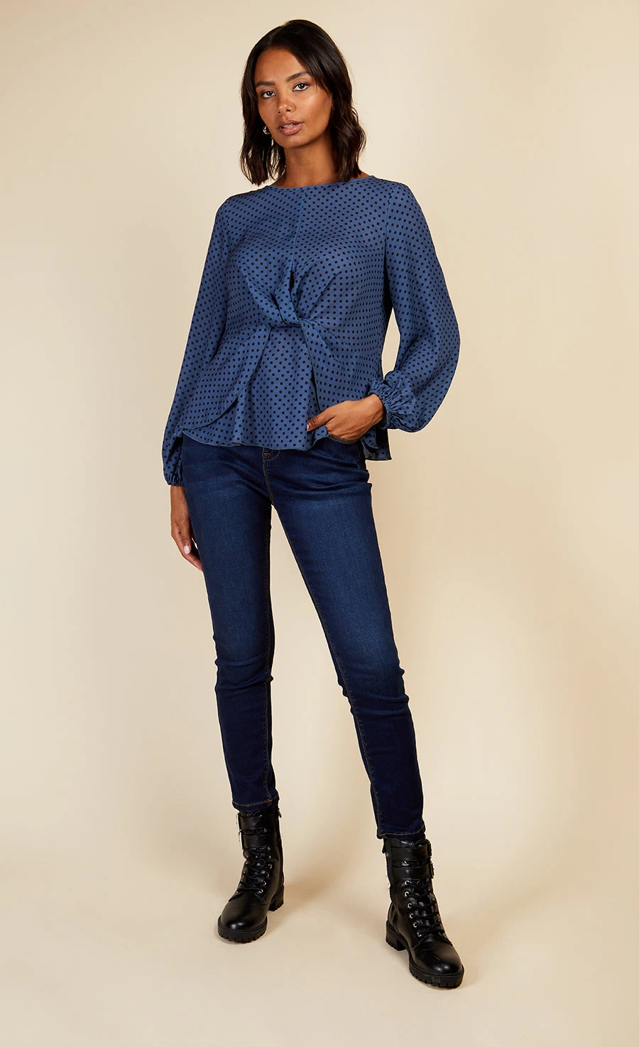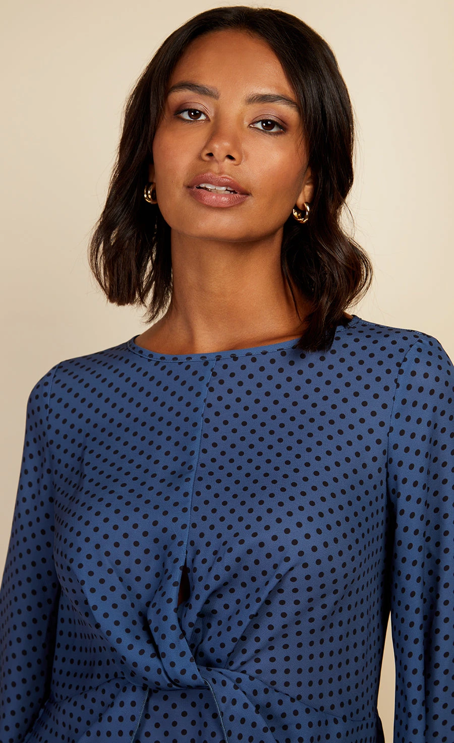 Your go-to polka dot top! Designed in a fit a flare silhouette with twist front detailing, voluminous sleeves and an all-over polka dot print. Perfect for dressing up your favourite pair of jeans!