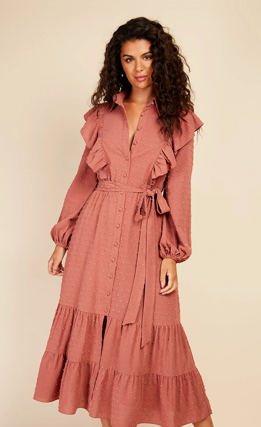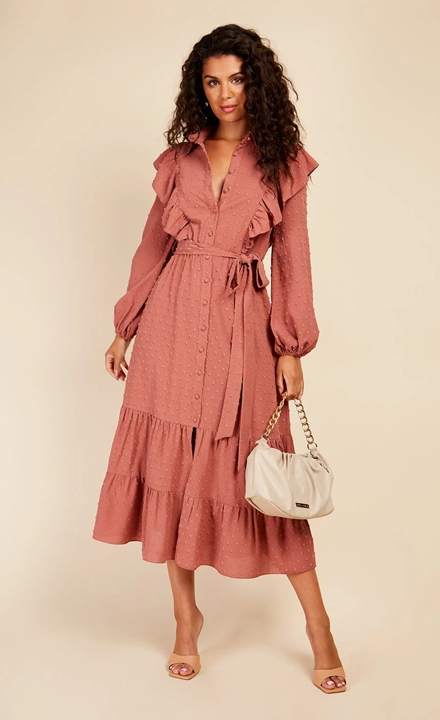 Our fondness for hyper-feminine details means you’ll find a tiered hem, blouson sleeves and ruffled trim adorning this chic shirt dress. Crafted from soft dobby fabric in a gorgeous rose hue, add ankle boots for a look that’s perfect for smart-casual weekend lunches.Â
