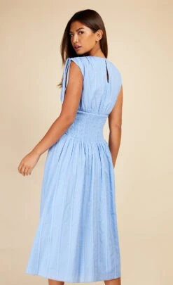 Whether you wear it for sunny days or special occasions, this dress guarantees compliments galore. Crafted from lightweight textured dobby fabric in cornflower blue, you’ll love how the gathered detail shows off your waist. Finished with a ruched shoulder detail, dress it up with heels and a clutch or down with sandals and a cross-body bag.