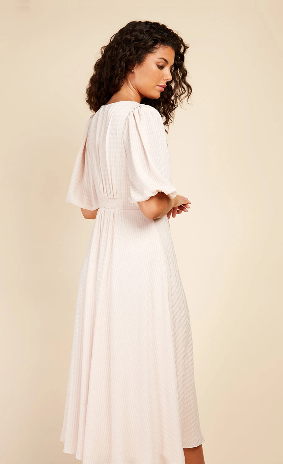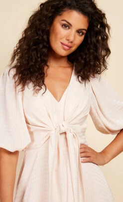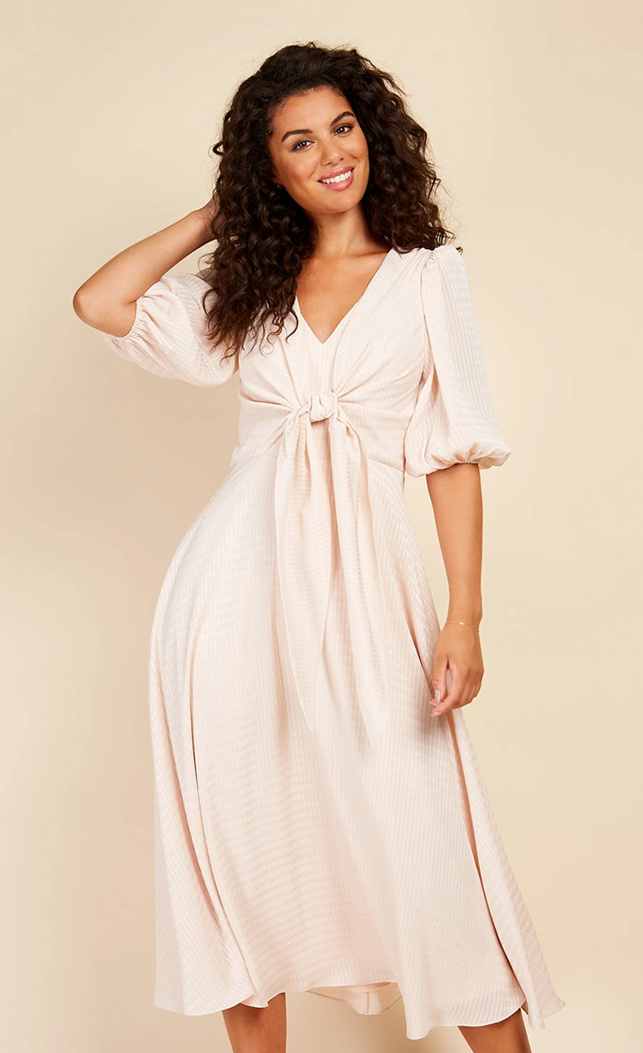 Meet your special occasion MVP. Effortlessly elegant, the plunging V-neck falls to a waist-defining knot detail whilst the midi skirt skims the body before flaring out from the knee. It’s topped off with puff sleeves to amplify the prettiness. Print placement may vary.