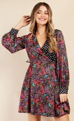 Mixed prints are trending, floral meets polka dot in this flirty mini dress. Crafted with a drawstring waistline and cross-over v neckline, toughen up your look with biker boots and a PU jacket.