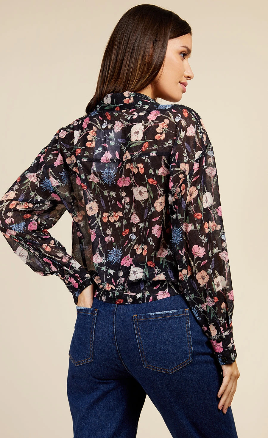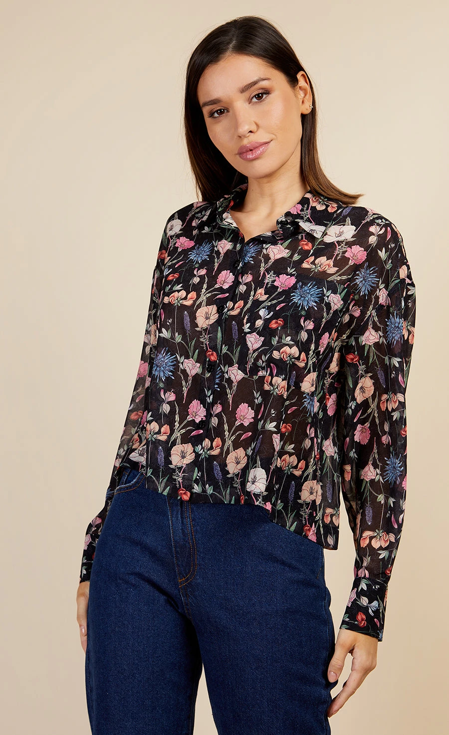 Floral blouse in a sheer chiffon fabric, featuring all-over floral print, cropped length and relaxed fit with long sleeves and summary-up closure at front. Print placement may vary.
