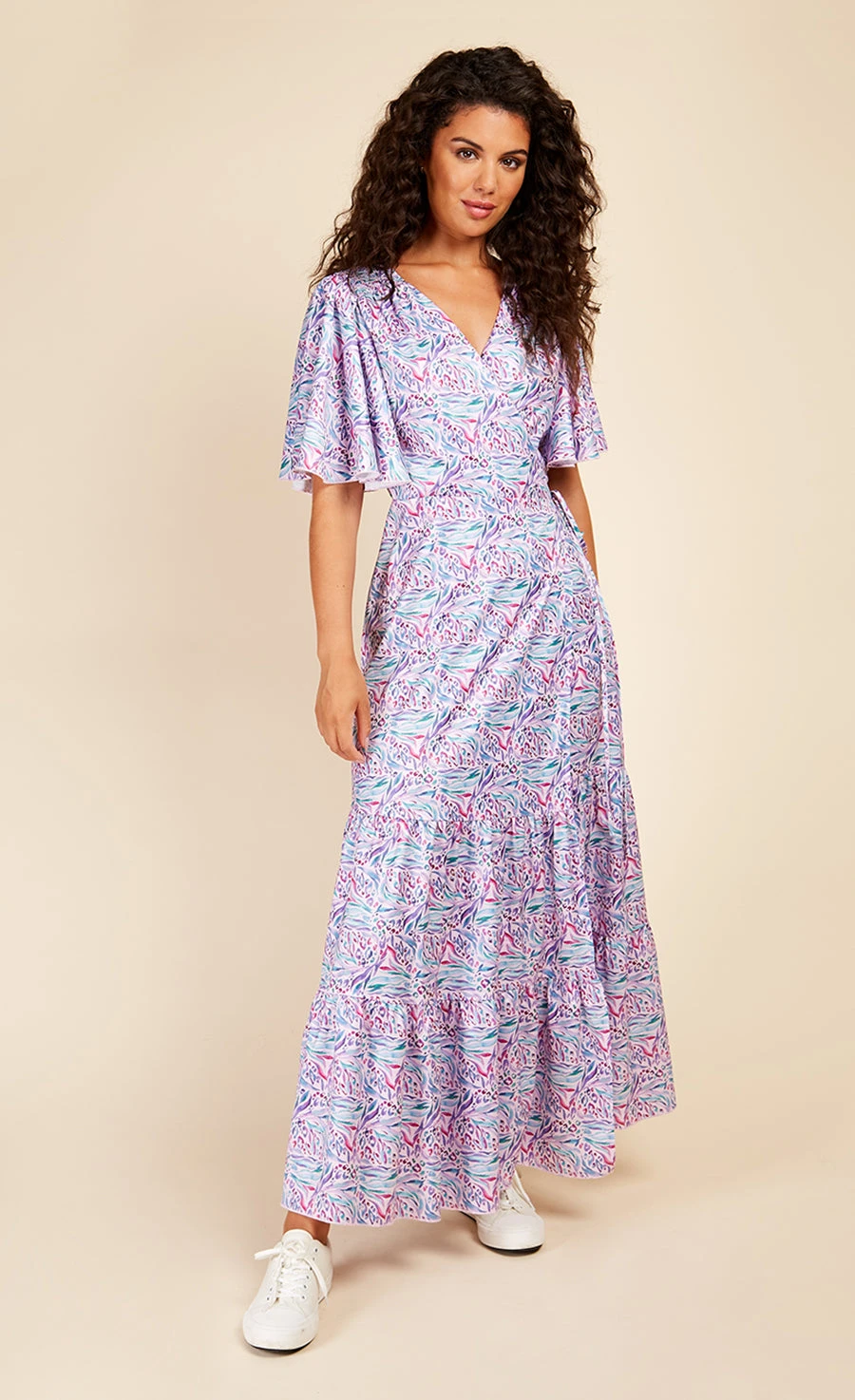 Angel sleeves, tiered hem, pastel print – this is a wrap dress with all the feminine feels. Cut in a classic (and ultra-flattering) wrap style, fluid satin fabric lends it a luxe feel that’s perfect for special occasions. We’re accessorising it with platforms and jewelled earrings. Print placement may vary.