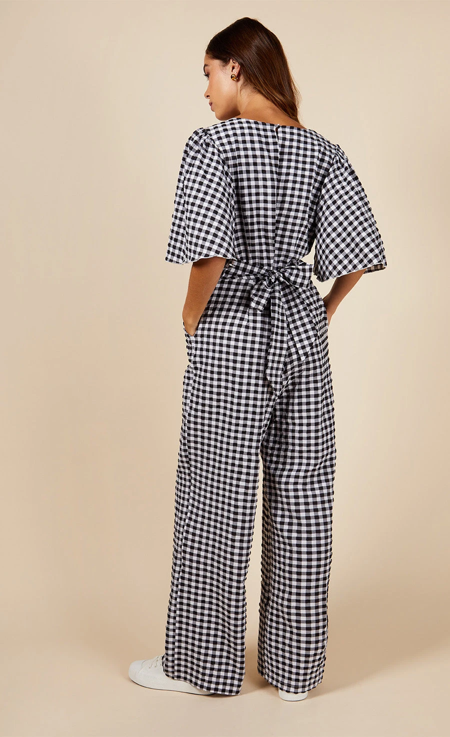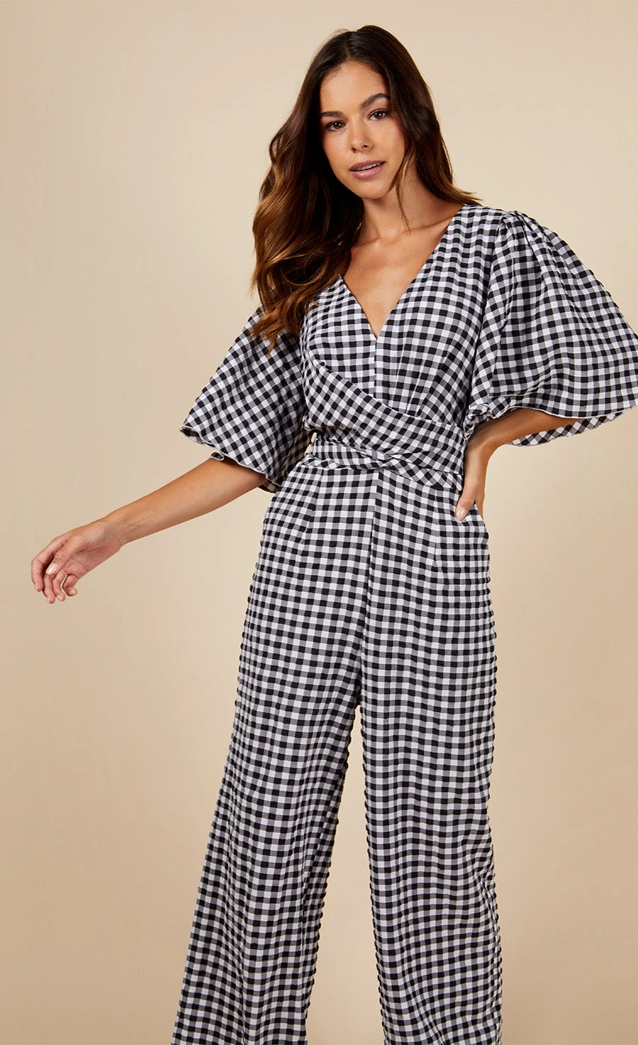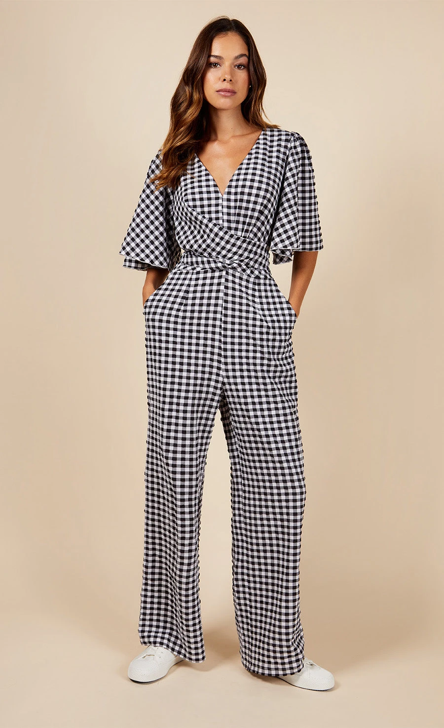 Timeless gingham transforms the ultra on-trend jumpsuit. Cut in a wide leg silhouette and finished with feminine angel sleeves and a wraparound waistband that ties at the back. Wear with trainers for the ultimate in off duty chic. Print placement may vary.
