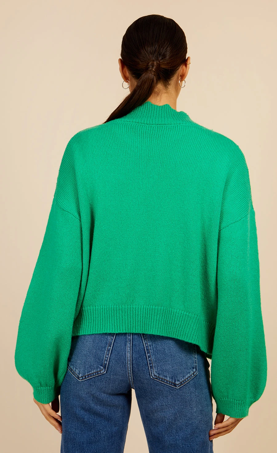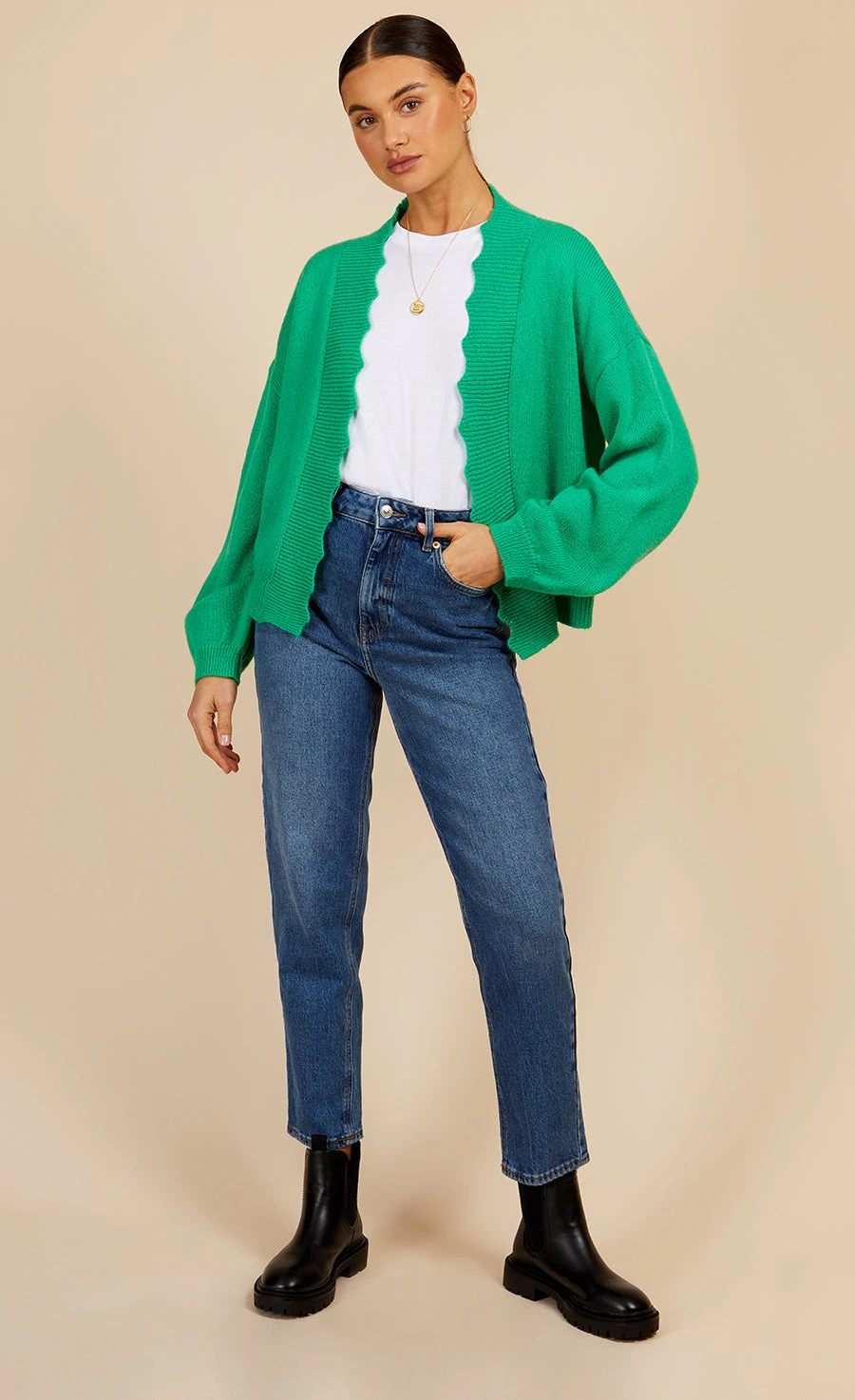 Lightweight, relaxed fit green knit open cardigan with blouson sleeves and ultra-feminine frill detail at front.Â
