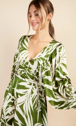 Think sunny Spring time days; the classic mini dress is given an on-trend update with bold leaf print and statement blouson sleeves, designed in a printed chiffon and featuring a drawstring waist for a versatile fit! Style with metallic heels or over the knee boots.
