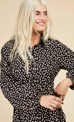 Woven swirl print midi dress with fitted empire waistline, high ruffle neckline with keyhole detail and flared hem skirt. Complete with balloon sleeve feature and elasticated cuffs. Print placement may vary.