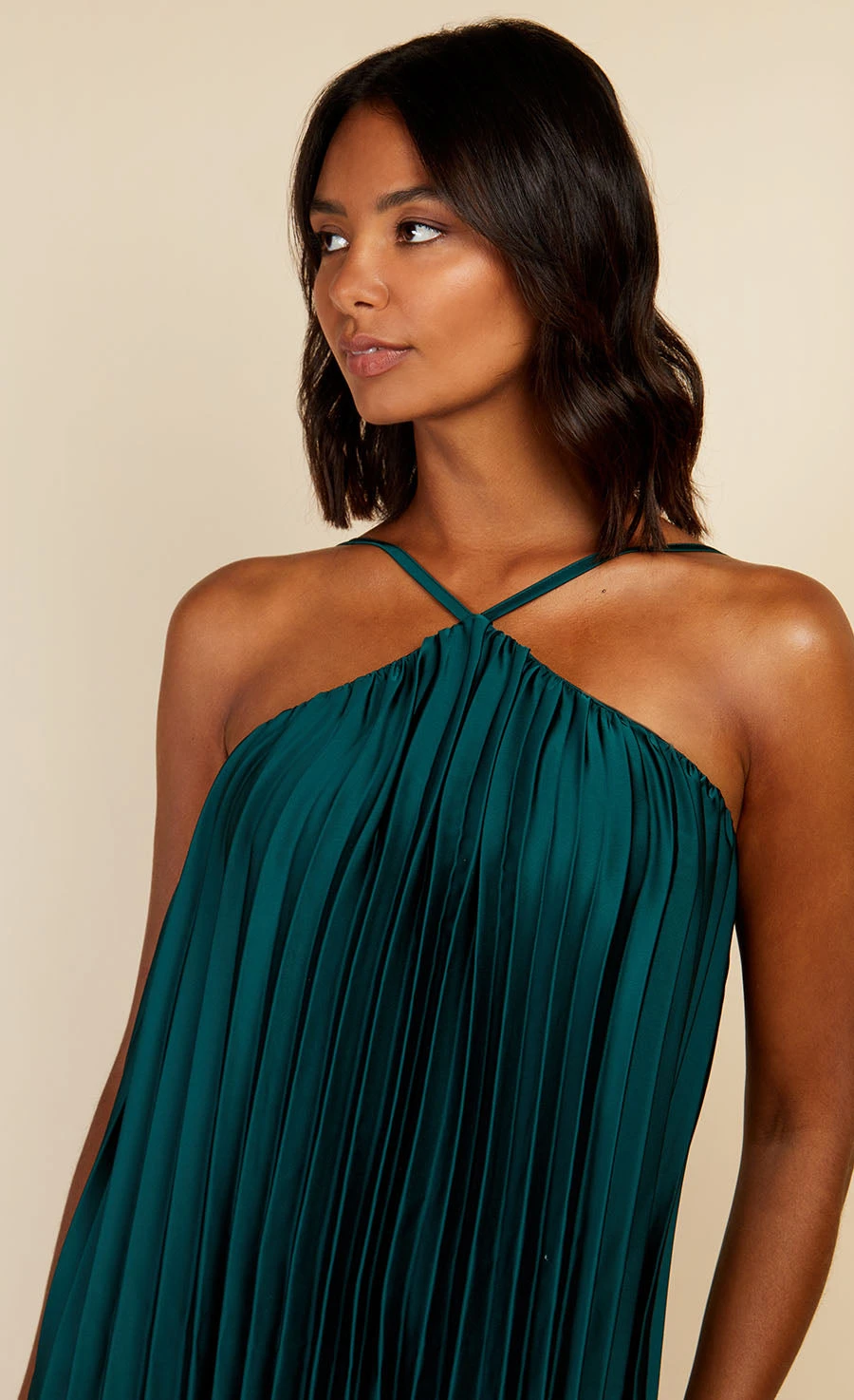 This seasons IT dress, the trapeze pleated midaxi has got us falling head over heels. Cut in a oversized trapeze silhouette, in a gorgeous emerald green satin, simply style with a barely there heel and statement earring.