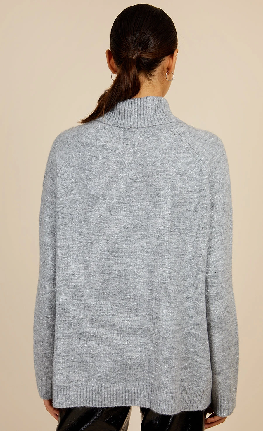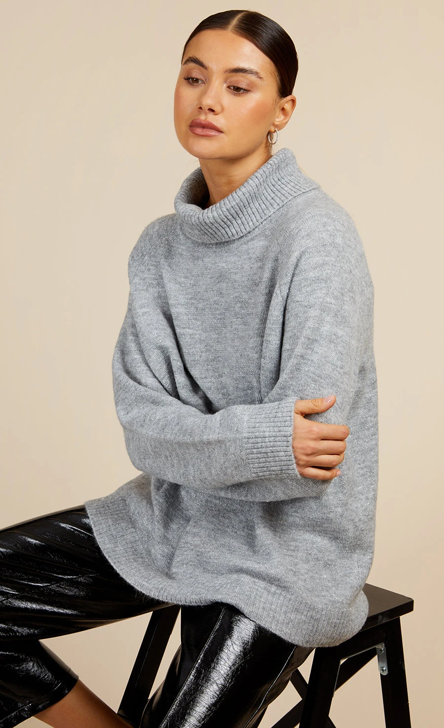 Relaxed fit, longline grey metallic knit jumper with ribbed polo neckline. The ultimate autumnal wardrobe staple.