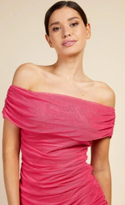 Little Mistress Hoxton Pink Bardot Ruched Bodycon Midi Dress