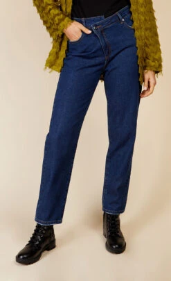 Blue denim skinny jeans in a washed stretch denim with high waist zip fly and slim legs.