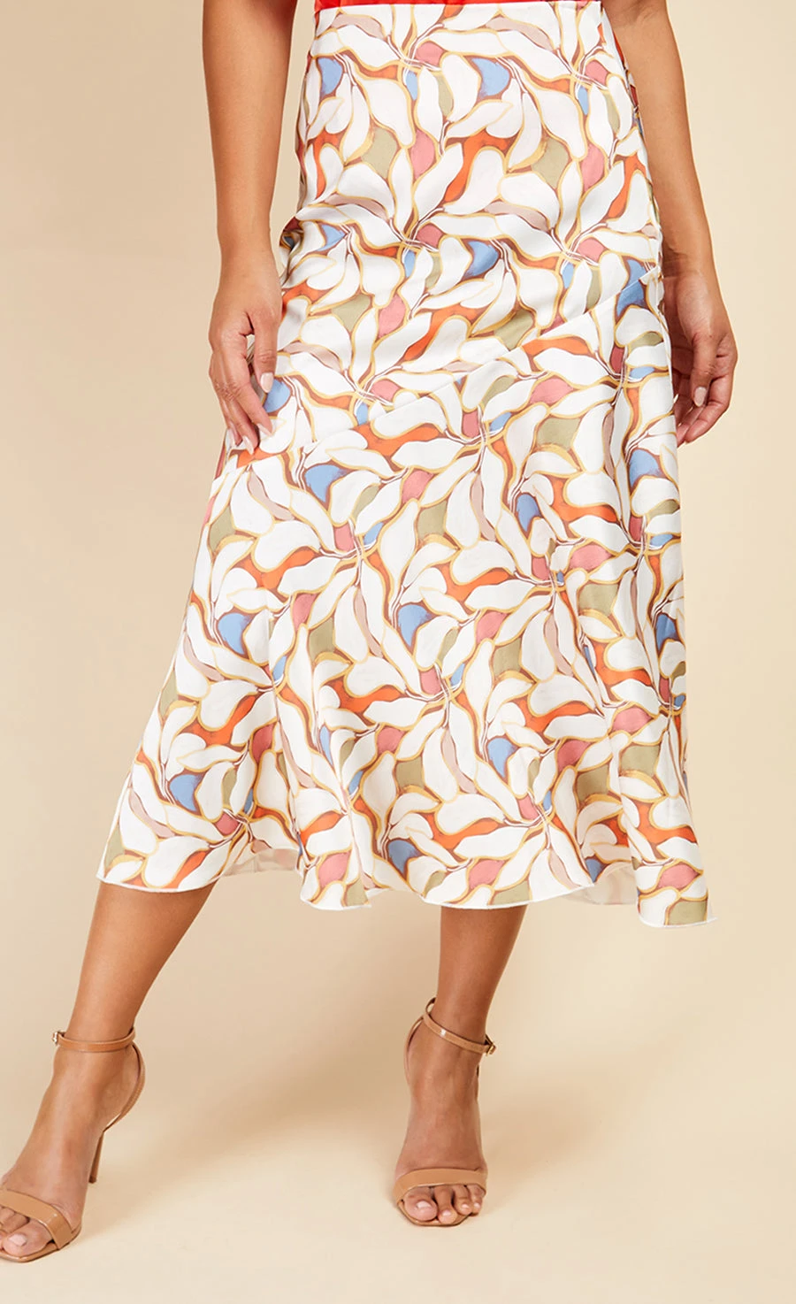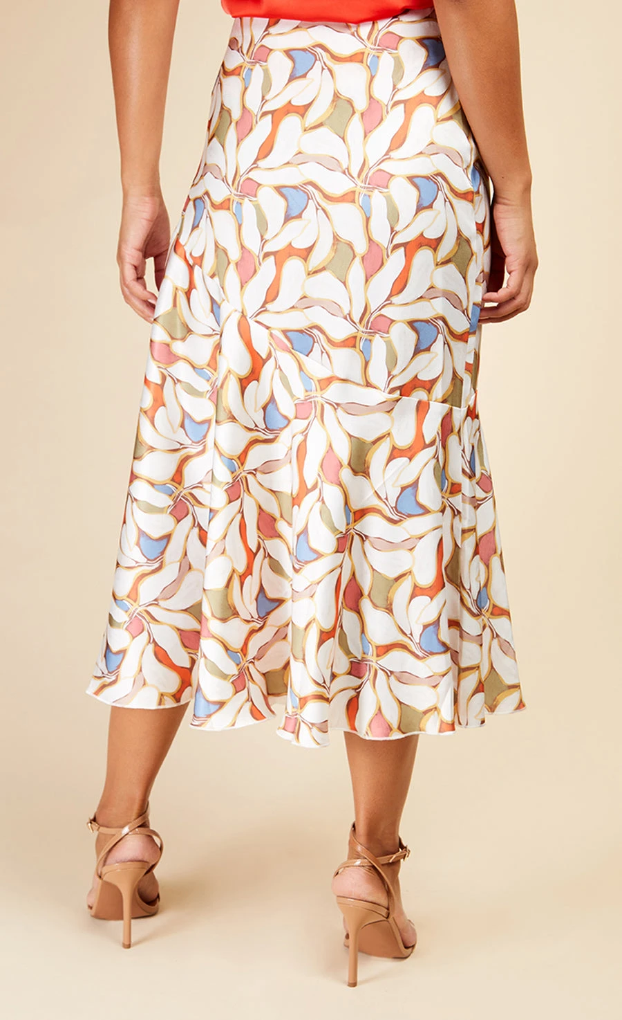 Crafted from a slinky satin fabric, the floral midi skirt features abstract leaf print, a flattering asymmetric seam and bias hemline. Print placement may vary.