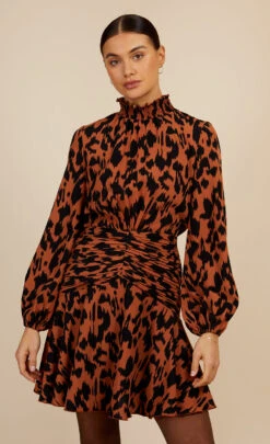 Leopard print satin mini dress. Featuring, ruched middle panel, high ruffle neck and flared skirt. With long blouson sleeves. Print placement may vary.