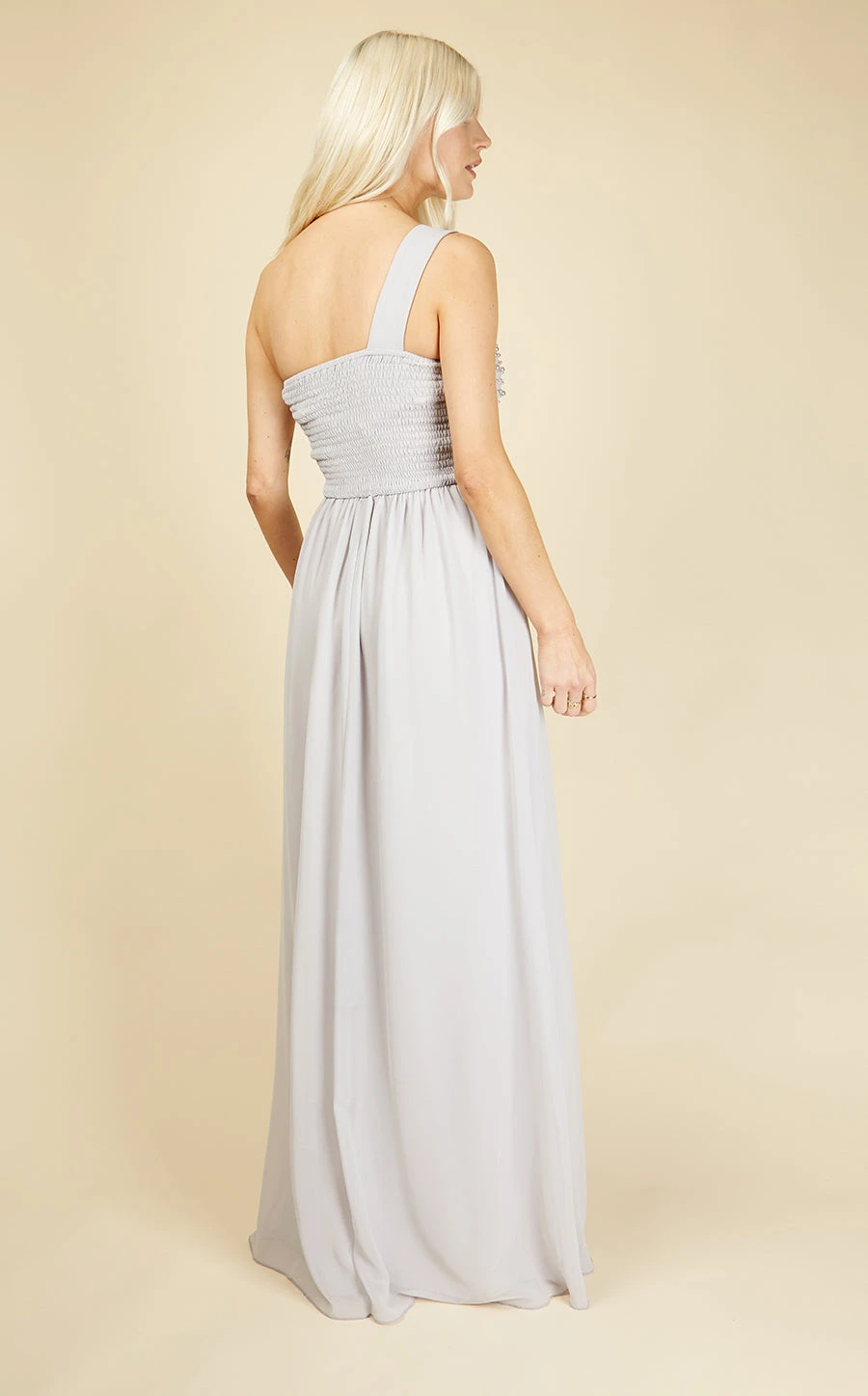 Bring a little Hollywood glamour to your day with our dramatic one-shoulder dress. Featuring luxe embellishment and a seriously flattering cross over waist detail, it’s simply stunning.Â