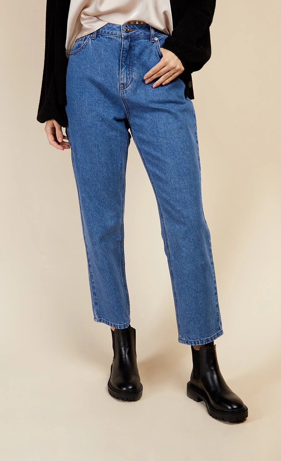 Mid-blue wash denim mom jeans, relaxed fit with gently tapered legs and a high waist design. Button and zip fly closure.Â