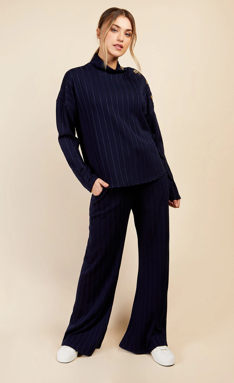 The ultimate in comfort and style. Crafted in a ribbed jersey and designed with a relaxed fit, featuring a high neck and shoulder summary detail for a trend-led twist on a casual statement. Style with matching trousers and trainers. Co-ord item available.
