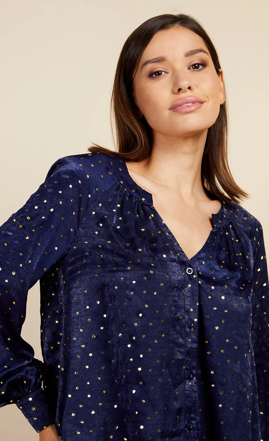 Crafted from a luxe satin, featuring gold spot detail, this blouse is a real beauty. A V-neck and blouson sleeves amplify the romance, and we’ve cut it in a loose silhouette for comfort and style – win, win!