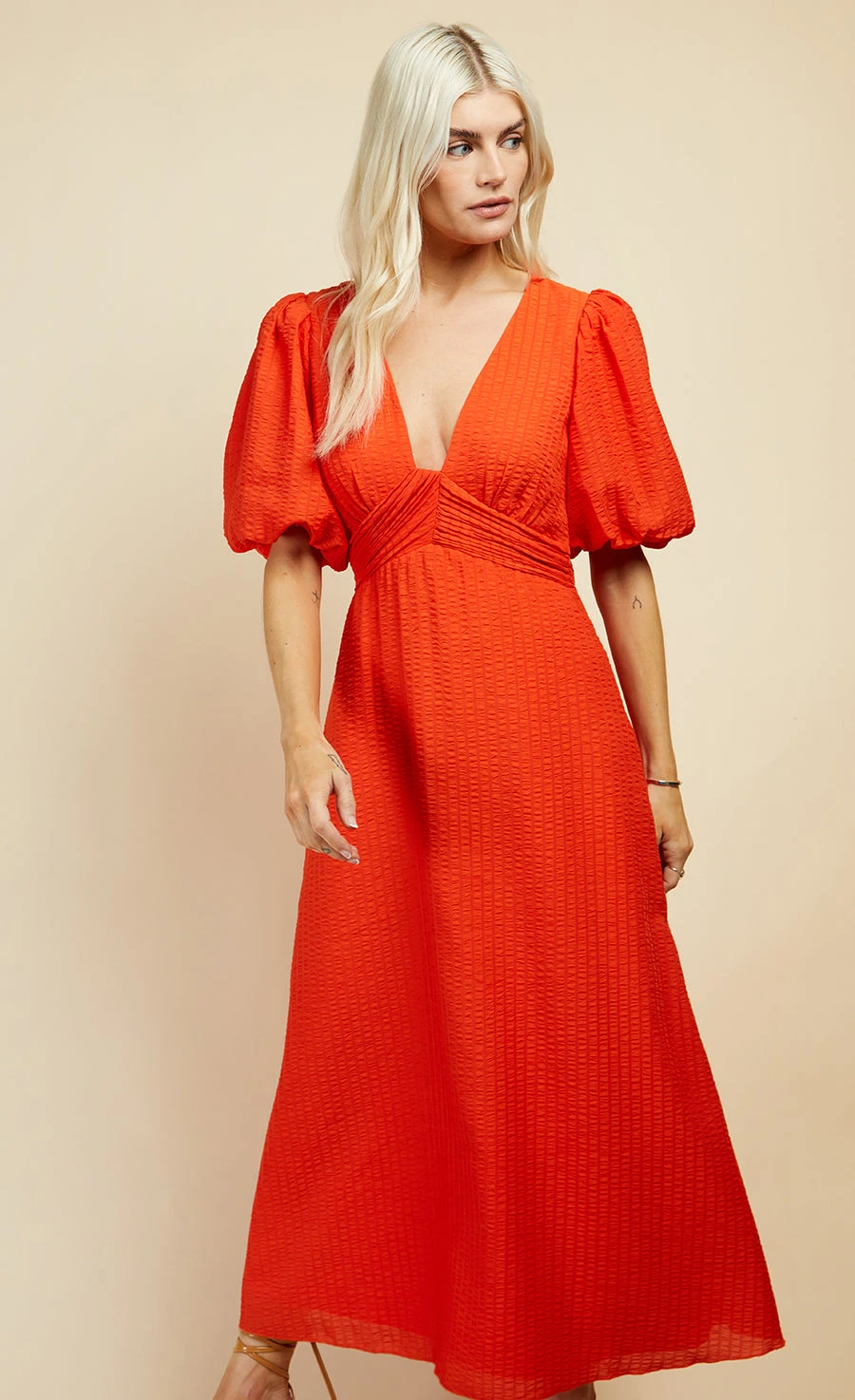 Stand out this summer in our stunning orange seersucker dress. With feminine puff sleeves, flattering ruched waist and a breezy maxi hem, it’s made for sunny days exploring markets or sipping Aperol Spritzes at summer weddings.Â