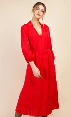 Brighten up cold weather days with a bold pop of colour in our statement red midi dress! Blouson sleeves, v-neck and cinched in waist make for an ultra-feminine design. Style with a chelsea boot by day and a barely there heel by night.