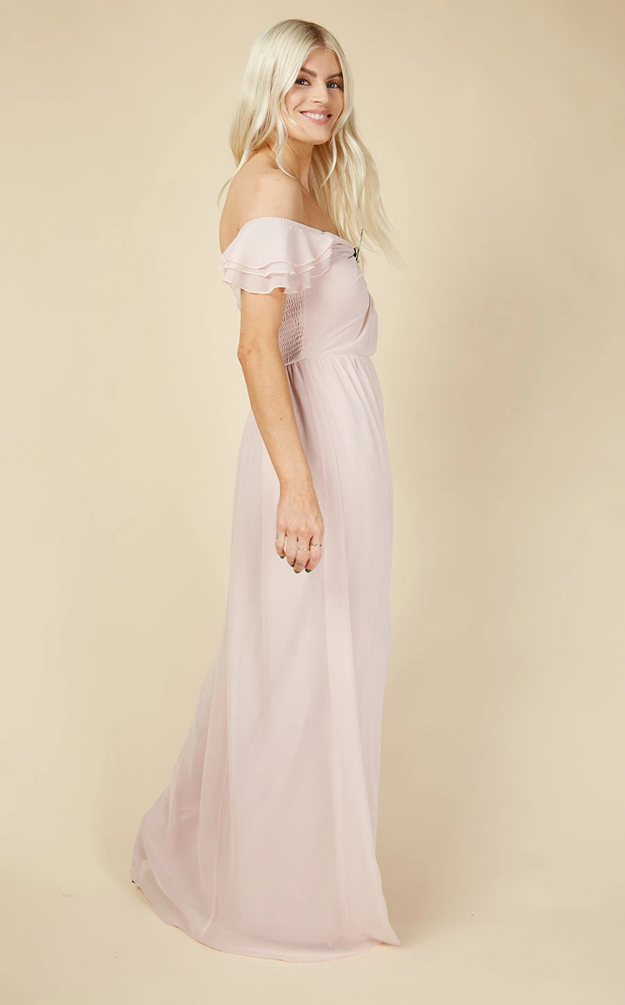 A heavenly pink chiffon gown that is perfect for bridesmaids and swish special events. We love the soft, draping sleeves that elegantly hang off the shoulders, the gathered bust detail and the simple split up to the knee.