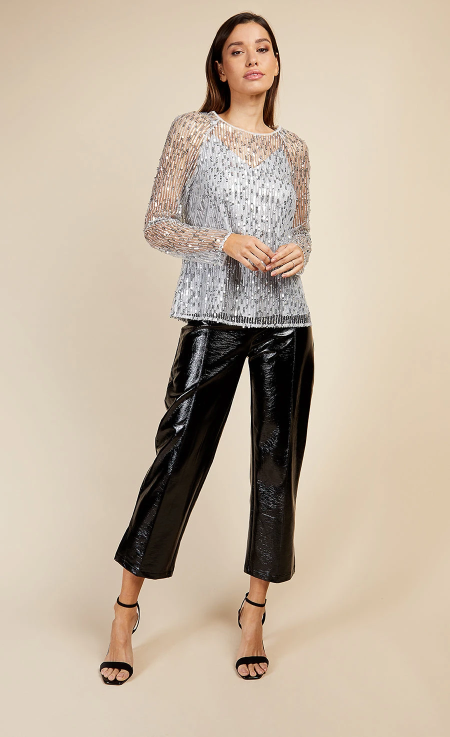 Silver sequin embellished mesh top with a round neckline, long sleeves and regular fit.