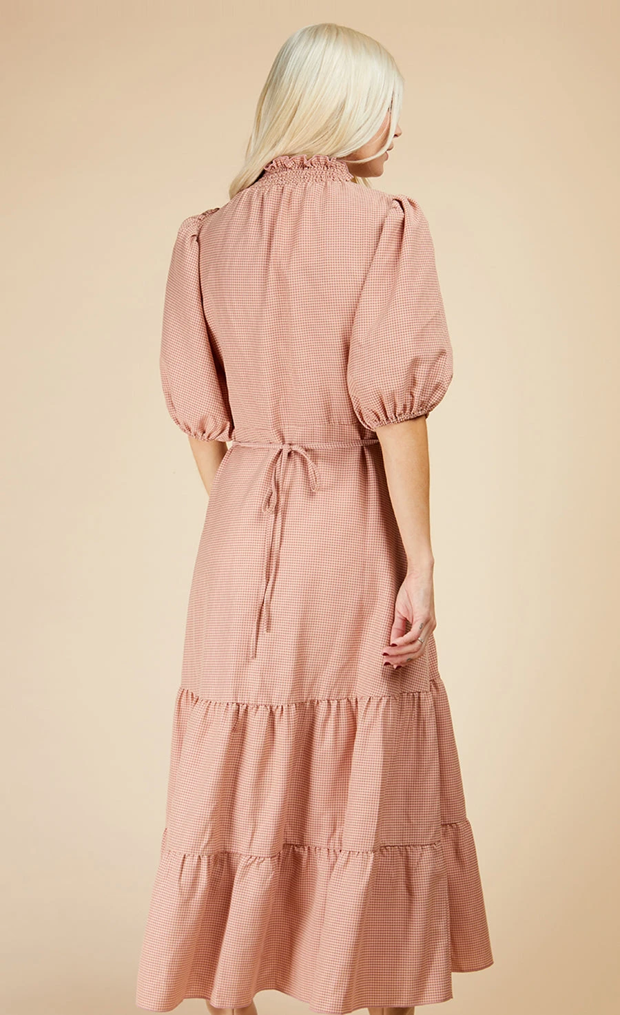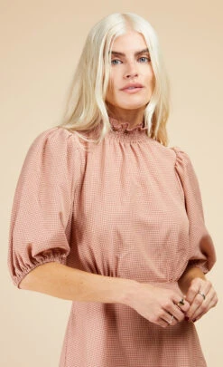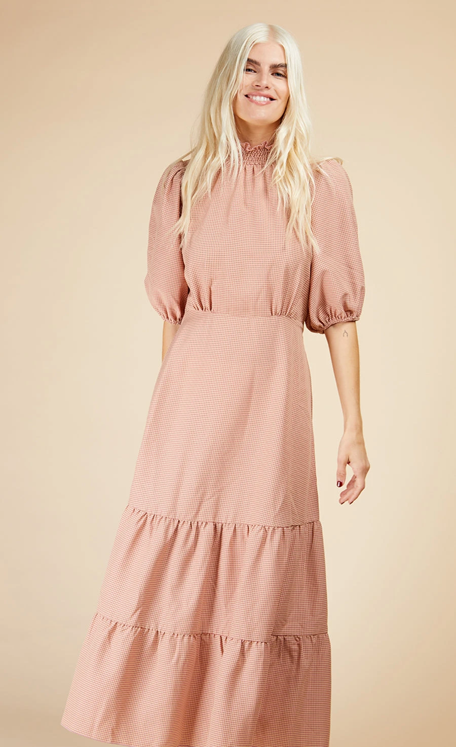 Your spring wardrobe starts with our gingham midi dress. That print may be cute, but the high neck, puff sleeves and tiered hem add a whopping dose of chic. Cut in a form-fitting shape, the under-the-bust seam accentuates the smallest part of your body for a feel-good fit.Â