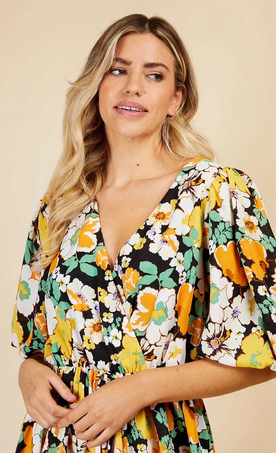 The secret to effortless warm-weather dressing? A cute playsuit blooming with bold vintage-inspired florals. Framed by dreamy puff sleeves, it’s belted at the waist to highlight your silhouette – just add wedges.Â