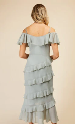 In the sweetest shade of sage green, this ultra-feminine maxi dress is made for bridesmaids and best-dressed guests. Covered with cascading frills and topped with sleek cami straps and a draped sleeve cold-shoulder detail.