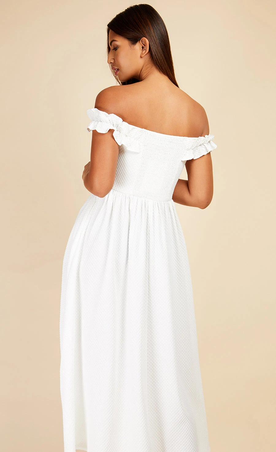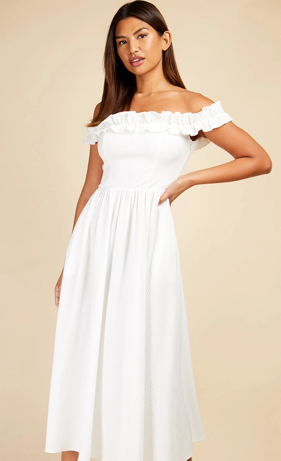 Featuring a frill bardot neckline, nipped in waist and flared midi skirt and crafted in a gorgeous waffle fabric, introducing the little white dress.