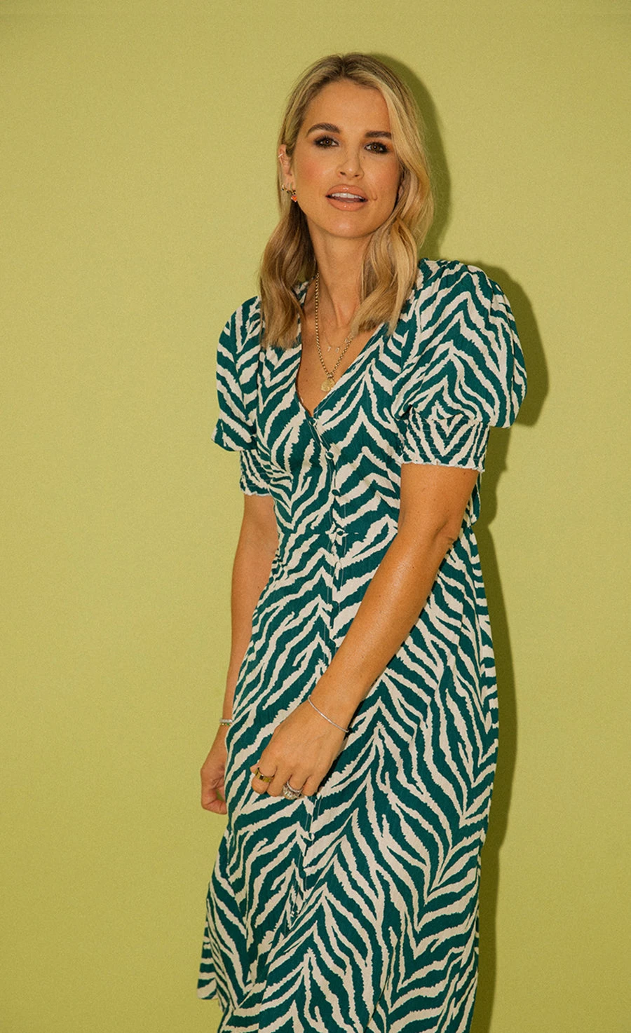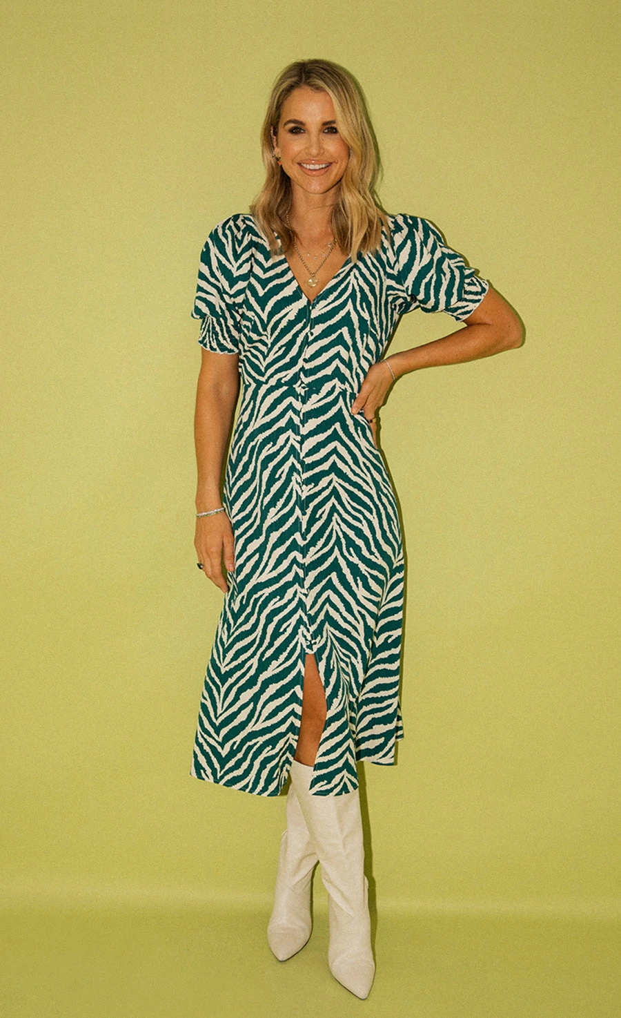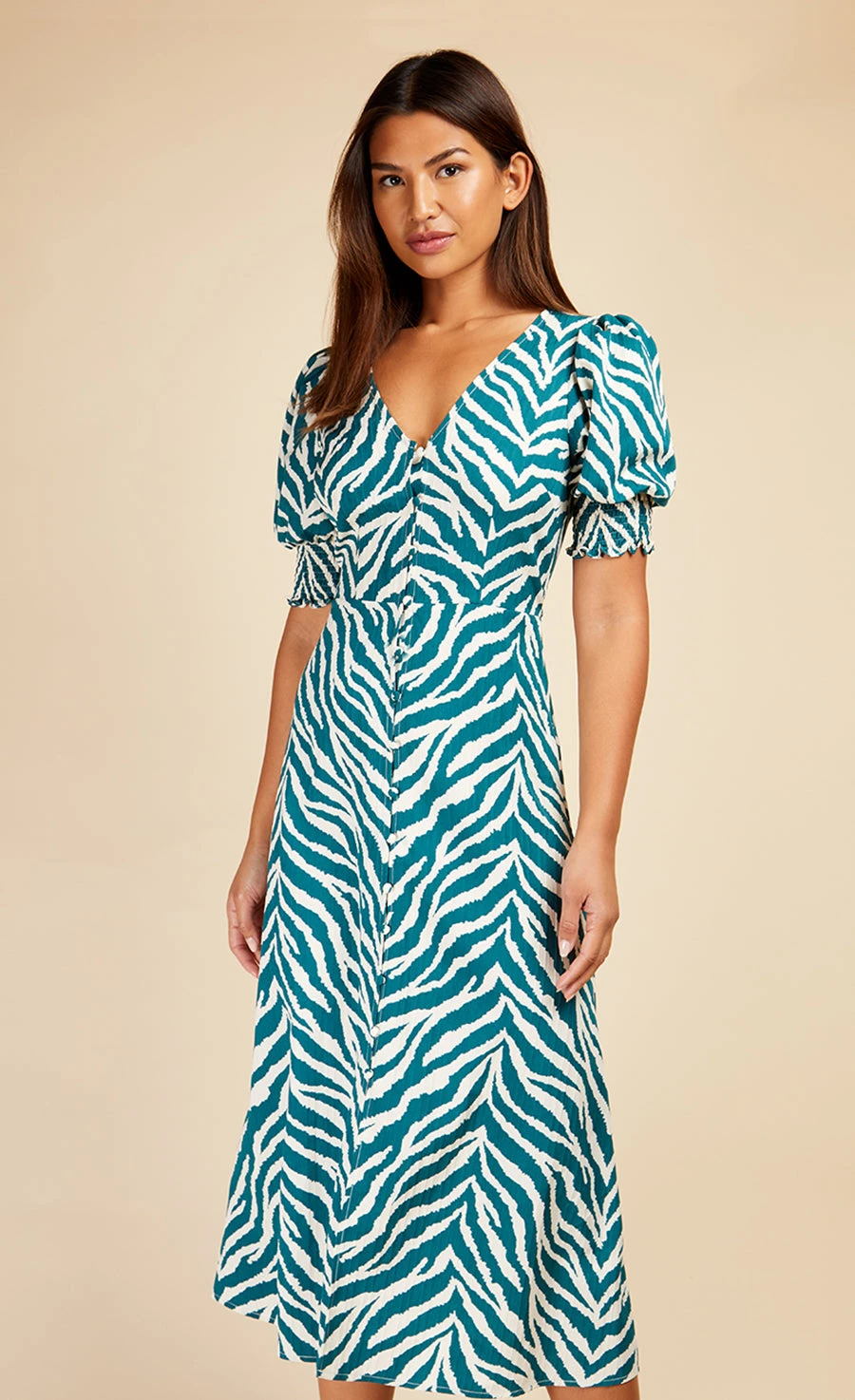 Introducing the new season dress of dreams. Making a statement whether dressed up with heels or down with trainers, this summary-front midaxi is splashed with a standout green zebra print. Featuring an under-the-bust seam to show off your waist, it’s framed with a plunging V-neckline and sweet puff sleeves. Print placement may vary.